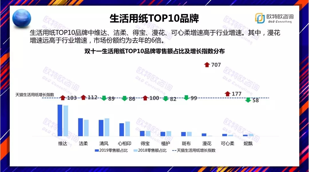 雙11已成為中國消費市場的一個縮影,更是中國消費趨勢的風(fēng)向標(biāo)。生活用紙方面,維達(dá)、潔柔、清風(fēng)占據(jù)前三甲,在TOP10中,維達(dá),潔柔、得寶、漫花、可心柔增速高于行業(yè)增速。那么下一個十年已經(jīng)開啟,誰將領(lǐng)跑中國消費市場呢?