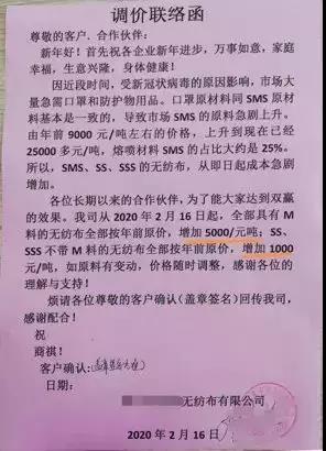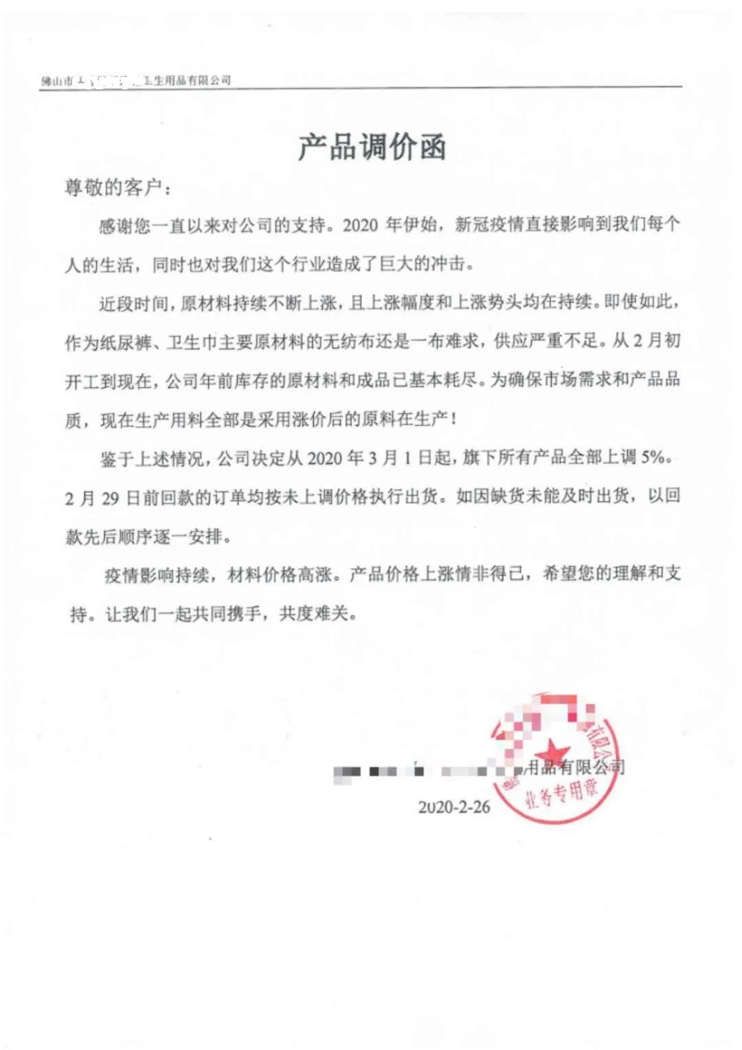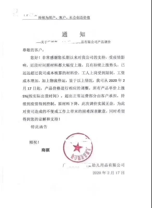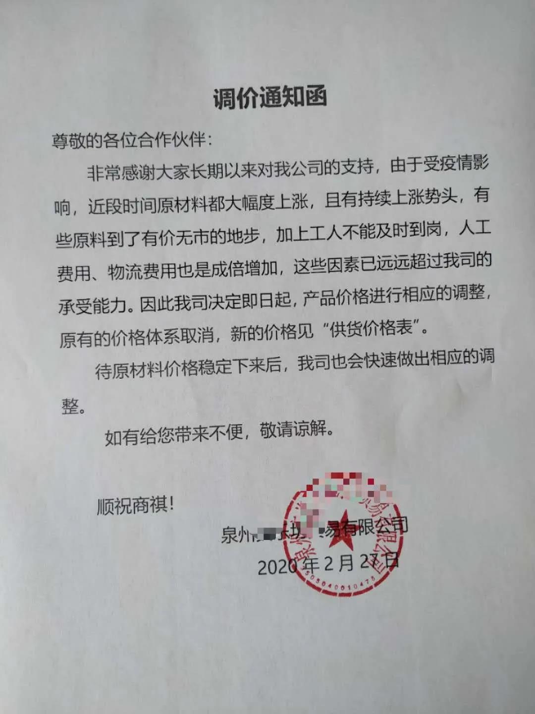 “3月1日起,旗下所有產(chǎn)品上調(diào)5%”,“產(chǎn)品價格進(jìn)行相應(yīng)調(diào)整,原有的價格體系取消”。所有產(chǎn)品單價上漲5%,超出正常運(yùn)費(fèi)部分由客戶承擔(dān),持續(xù)到疫情得到控制,原材料下降”