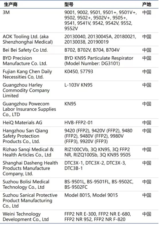 附:FDA 授權(quán)進(jìn)口的非 NIOSH 批準(zhǔn)的中國口罩商名單(5月7日更新)