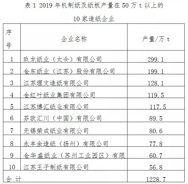 2019年江蘇省機制紙及紙板年產(chǎn)200萬t以上的企業(yè)有1家;年產(chǎn)100萬~200萬t的企業(yè)有4家;年產(chǎn)50萬~100萬t的企業(yè)有5家;年產(chǎn)10萬~50萬t的企業(yè)有10家。