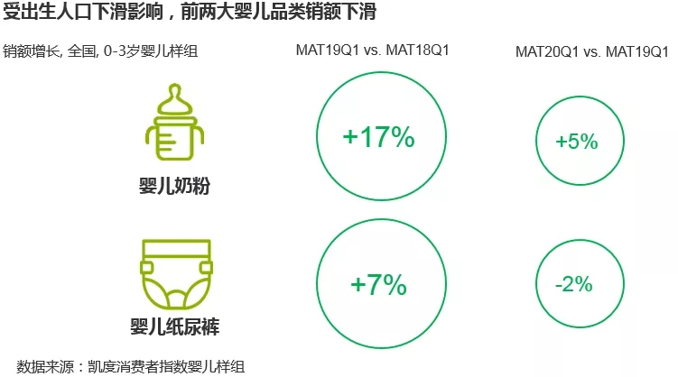 受到新生人口減少的影響,母嬰市場(chǎng)兩大頭部品類——奶粉和紙尿褲增長(zhǎng)開(kāi)始放緩。凱度消費(fèi)者指數(shù)顯示,2019年一季度嬰兒紙尿褲銷售額同比增長(zhǎng)7%,但2020年一季度同比下滑了2%,這一部分下跌與年初的疫情事實(shí)上關(guān)系不大。多位資深從業(yè)者表示,即便身處動(dòng)蕩的疫情環(huán)境下,消費(fèi)者對(duì)于奶粉、紙尿褲這樣的剛需產(chǎn)品的投入絲毫不會(huì)吝嗇。