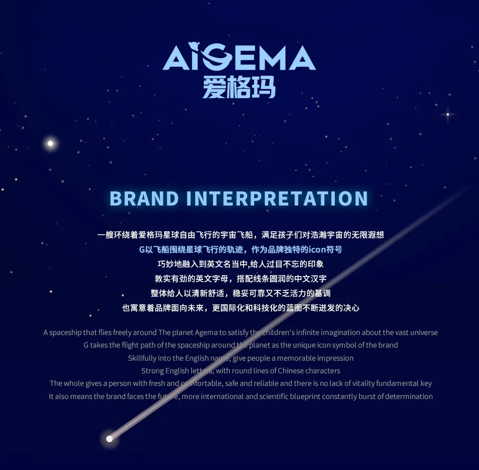 有故事的LOGO,飛船+星軌,小小星夢從此開始。愛格瑪星系宇宙,架構(gòu)起所有關(guān)于愛的哲學(xué)的童話意義。簡潔內(nèi)趣,帶領(lǐng)品牌踏上愛的新征程。