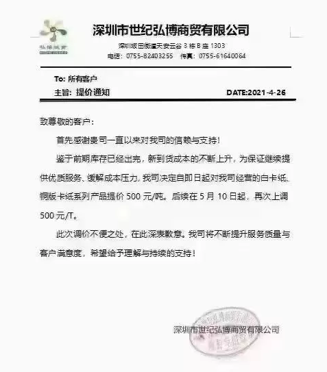 世紀(jì)弘博:即日起對我司經(jīng)營的白卡紙、銅版卡紙系列產(chǎn)品提價500元/噸。后續(xù)在5月10日起,再次上調(diào)500元/噸。