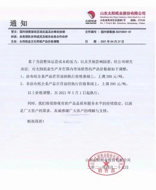 太陽紙業(yè):5月1日起,涂布紙全系產(chǎn)品在目前的執(zhí)行價格基礎(chǔ)上,上調(diào)200元/噸。非涂布紙全系產(chǎn)品在目前的執(zhí)行價格基礎(chǔ)上,上調(diào)200元/噸。