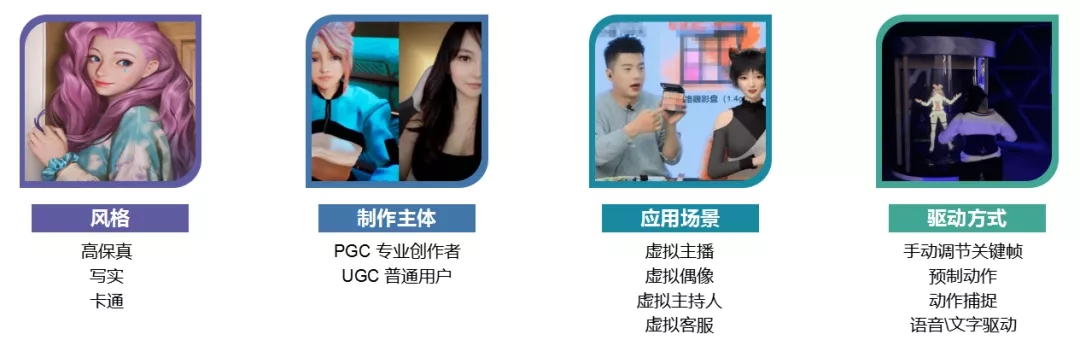 對(duì)于虛擬人的技術(shù)分類(lèi),我們可以從風(fēng)格、創(chuàng)作主體、應(yīng)用場(chǎng)景、驅(qū)動(dòng)方式幾個(gè)方面進(jìn)行了解: