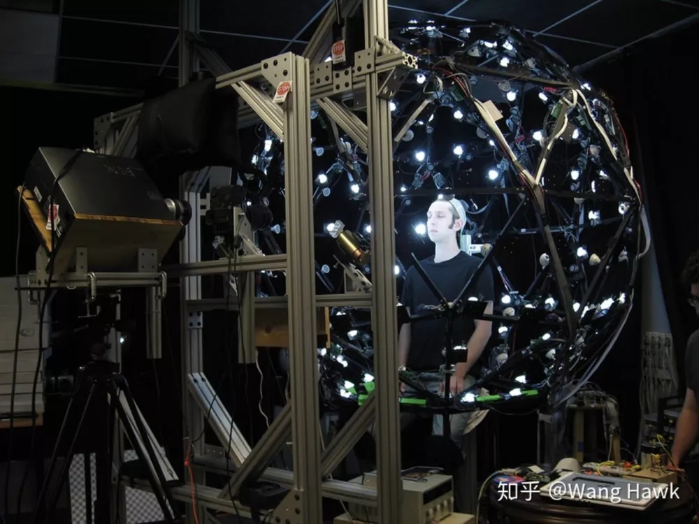 Light stage技術(shù)正是通過(guò)構(gòu)造相機(jī)陣列,以多角度、高精度照片,既還原拍攝人物的三維結(jié)構(gòu),也獲取面部的反射信息,從而能在不同環(huán)境光下重構(gòu)人臉模型光效。