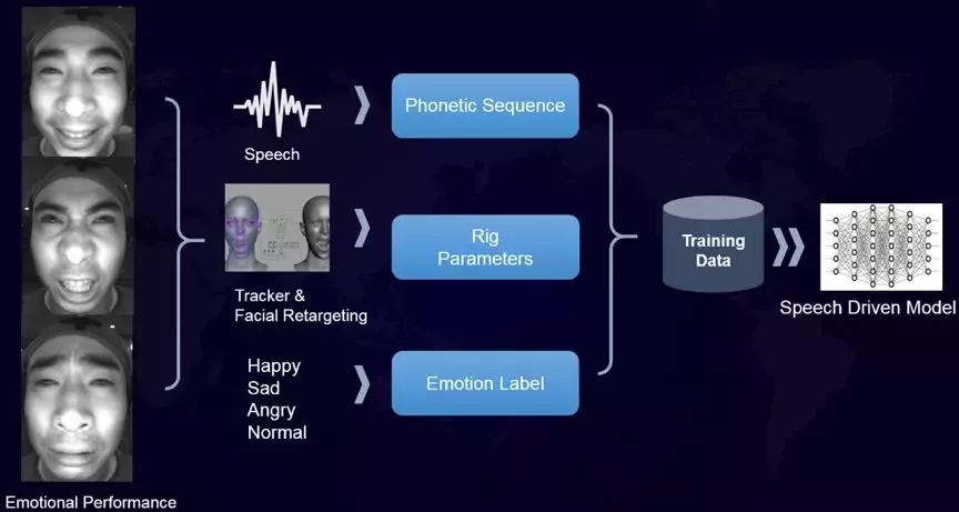 為此,團(tuán)隊(duì)建立了一套精確的面部動(dòng)捕流程,以不同情感下的動(dòng)作捕捉,來(lái)訓(xùn)練語(yǔ)音驅(qū)動(dòng)模型,最終構(gòu)造了一個(gè)長(zhǎng)約20個(gè)小時(shí)、13339條語(yǔ)句的,包含語(yǔ)音、面部運(yùn)動(dòng)和身體運(yùn)動(dòng)的多模態(tài)訓(xùn)練數(shù)據(jù)集。在Siren AI 基礎(chǔ)上,增加情感維度數(shù)據(jù),讓Matt擁有微笑、蹙眉等微表情,多了更自然的“人情味”。