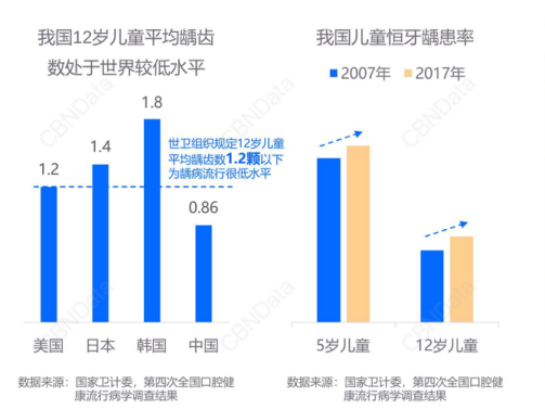 根據(jù)第四次全國口腔健康流行病學調(diào)查結(jié)果顯示,中國5歲兒童乳牙齲患(即蛀牙)率為70.9%,12歲兒童恒牙齲患率為34.5%。與十年前相比,5歲和12歲兒童齲患率分別上升了5.8%、7.8%。這也意味著,我國兒童口腔問題日益加劇。