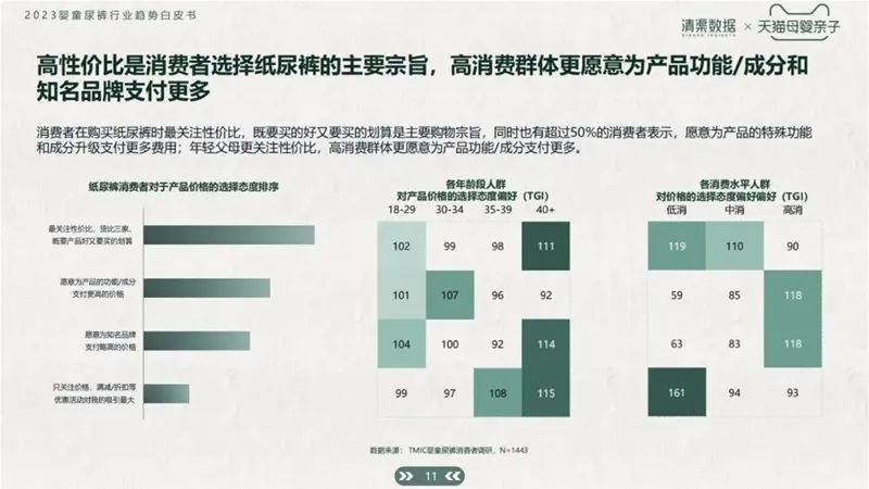 根據(jù)白皮書(shū)數(shù)據(jù)顯示,消費(fèi)者在購(gòu)買(mǎi)紙尿褲時(shí)最關(guān)注性?xún)r(jià)比,“又好又劃算”是主要購(gòu)物宗旨,同時(shí)也有超過(guò)50%的消費(fèi)者表示,愿意為產(chǎn)品的特殊功能和成分升級(jí)支付更多費(fèi)用:年輕父母更關(guān)注性?xún)r(jià)比,高消費(fèi)群體更愿意為產(chǎn)品功能/成分支付更多。