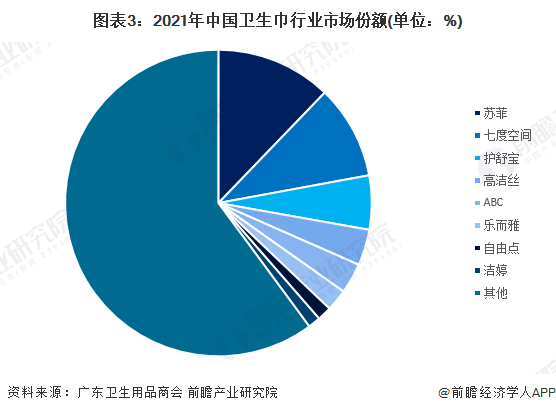 數據顯示,2021年中國衛(wèi)生巾行業(yè)市場份額前三的品牌分別是蘇菲、七度空間以及護舒寶,市場份額分別為12%、10%和6%。衛(wèi)生巾行業(yè)品牌數量眾多,頭部品牌市場份額相對較小。