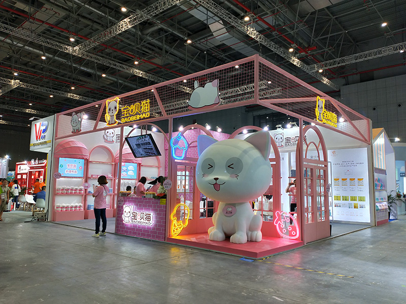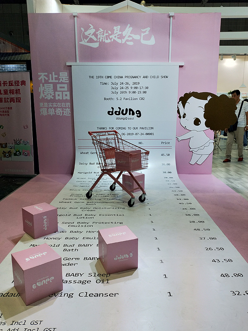 冬己展位結(jié)合卡通IP做出購物車和賬單的場景,巧妙地利用場地空間制造立體視覺,頗具想象力的設(shè)計實現(xiàn)有效地引流。