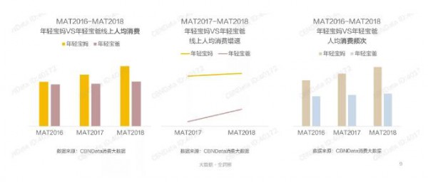 在更為開放、富足的環(huán)境下成長起來的80、90后年輕一代,大多受過良好的教育,生活水平也有所提高,他們在育兒觀念上更加開放,在包括紙尿褲在內(nèi)的眾多母嬰用品上,年輕寶爸寶媽更舍得花錢,他們有強(qiáng)烈的消費意愿,還具備足夠的支付能力,成為母嬰消費市場的中堅力量。數(shù)據(jù)顯示,近年來,年輕寶媽寶爸的線上人均消費逐年提升。相比寶爸,寶媽的增速更快,達(dá)到兩位數(shù)的高速增長,消費潛力巨大。從消費頻次來看,年輕寶媽更愛剁手,他們的消費頻次遠(yuǎn)高于寶爸。